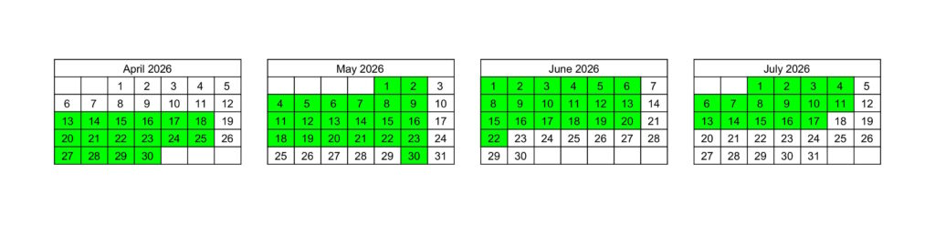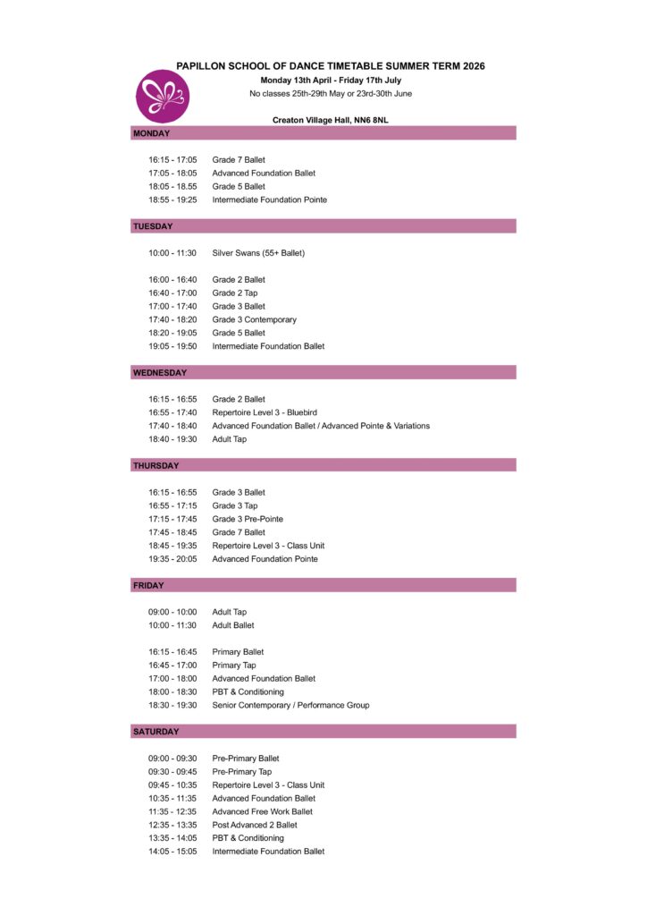 Our summer term is 12 weeks long – term dates are highlighted in green. All classes will take place in Creaton Village Hall, NN6 8NL.