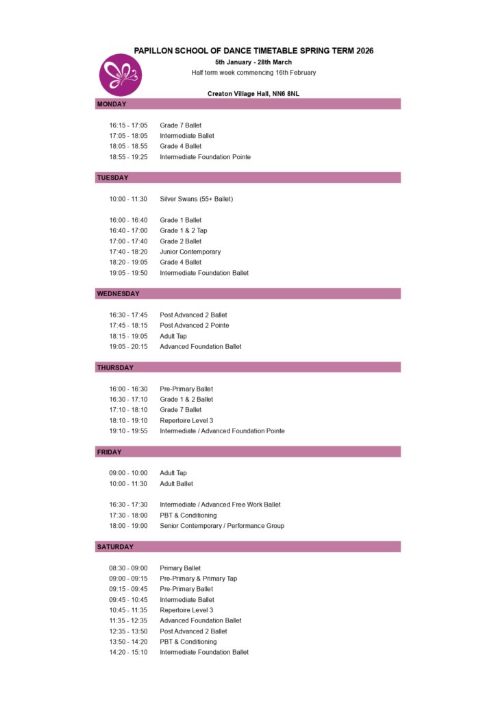 Our spring term is 12 weeks long, with no classes running during half term. All classes will take place in Creaton Village Hall, NN6 8NL.